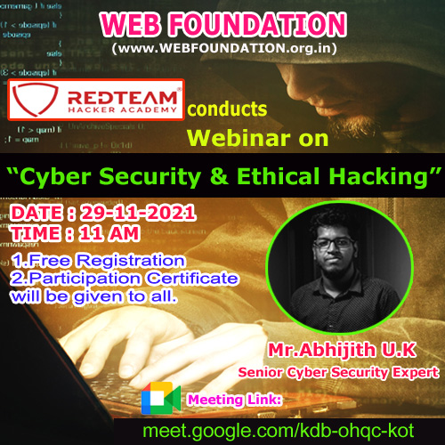 Web Foundation and Red Team Hacker Academy will jointly organize a webinar on "Cyber Security and Ethical Hacking" on 29-11-2021 through Google Meet. All the students and interested peoples are asked to register the same.Participate certificate will be given to all participants.