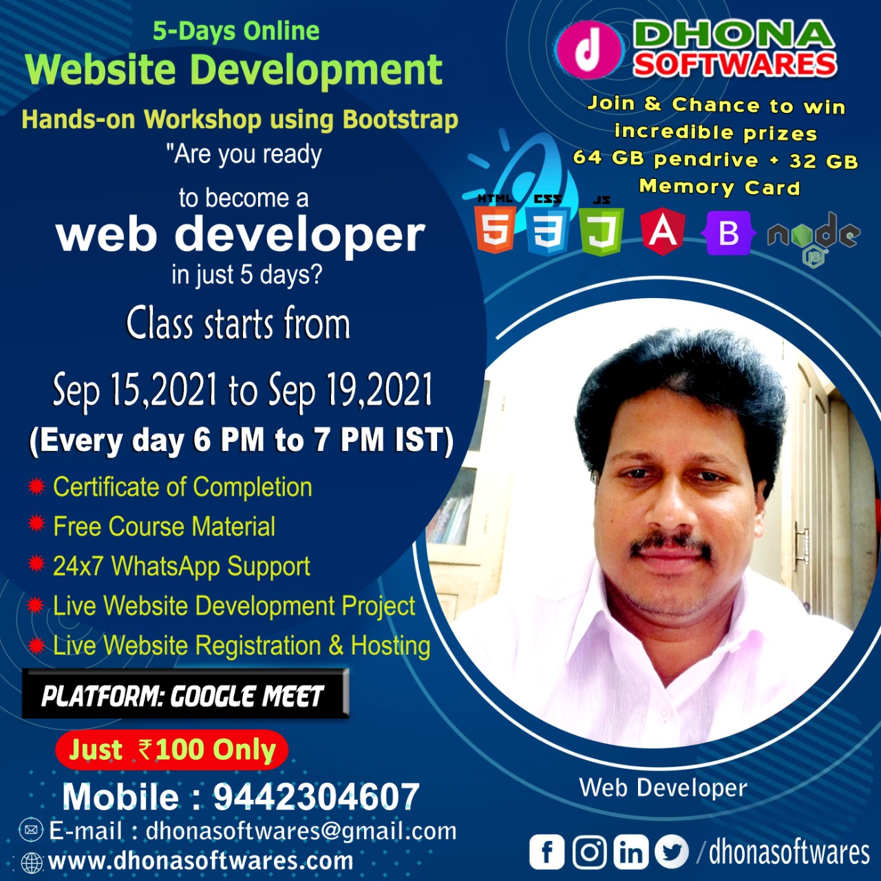 Web Foundation and Dhona Softwares will jointly organize a hands-on workshop on "Website Designing using Bootstrap" from 15-09-2021 to 10-09-2021 through Google Meet. All the students and interested peoples are asked to register the same.Certificate of completion will be given to all participants.